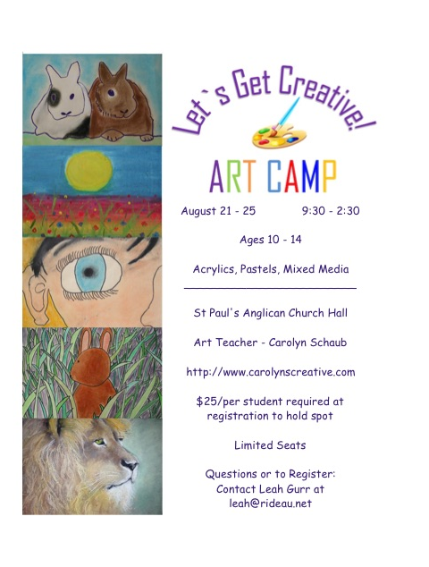 10-14 yr old multi media art camp with Carolyn Schaub. 25$ per person 9:30am – 2:30pm at St Paul’s Anglican Church Hall Westport, Ontario.