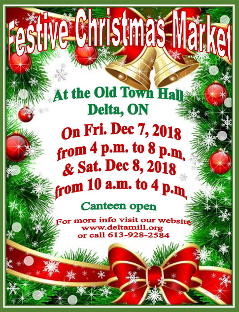 We’re having a Festive Christmas Market with many different vendors. Friday, December 7 from 4 pm to 8 pm and Saturday, December 8 from 10 am to 4 pm. Free admission – come & browse and maybe pick up a gift or two for someone special. Hot dogs and refreshments will be for sale in the Stone Mill Café. Vendors if you are interested in selling at our Christmas Market please email info@deltamill.org or call 613-928-2584 before Nov 30th to rent a 6′ table for $10.