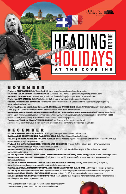 Sat.Nov.25 SANTA CLAUS PARADE MATINEE with HENRY NORWOOD + SHAWN McCULLOUGH (Country, Perth/Westport) 1-4pm www.facebook.com/henrynorwoodartist www.reverbnation.com/shawnmccullough + HEAD OVER HEELS (Acoustic Folk, Gananoque) 6-9pm www.headoverheelsmusic.blogspot.ca