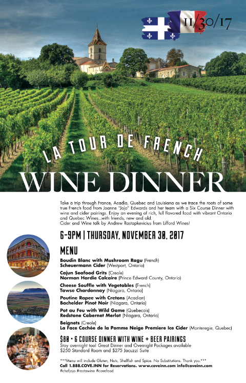 Thu.Nov.30 “TOUR de FRENCH” WINE DINNER (From France to Quebec to Louisiana)