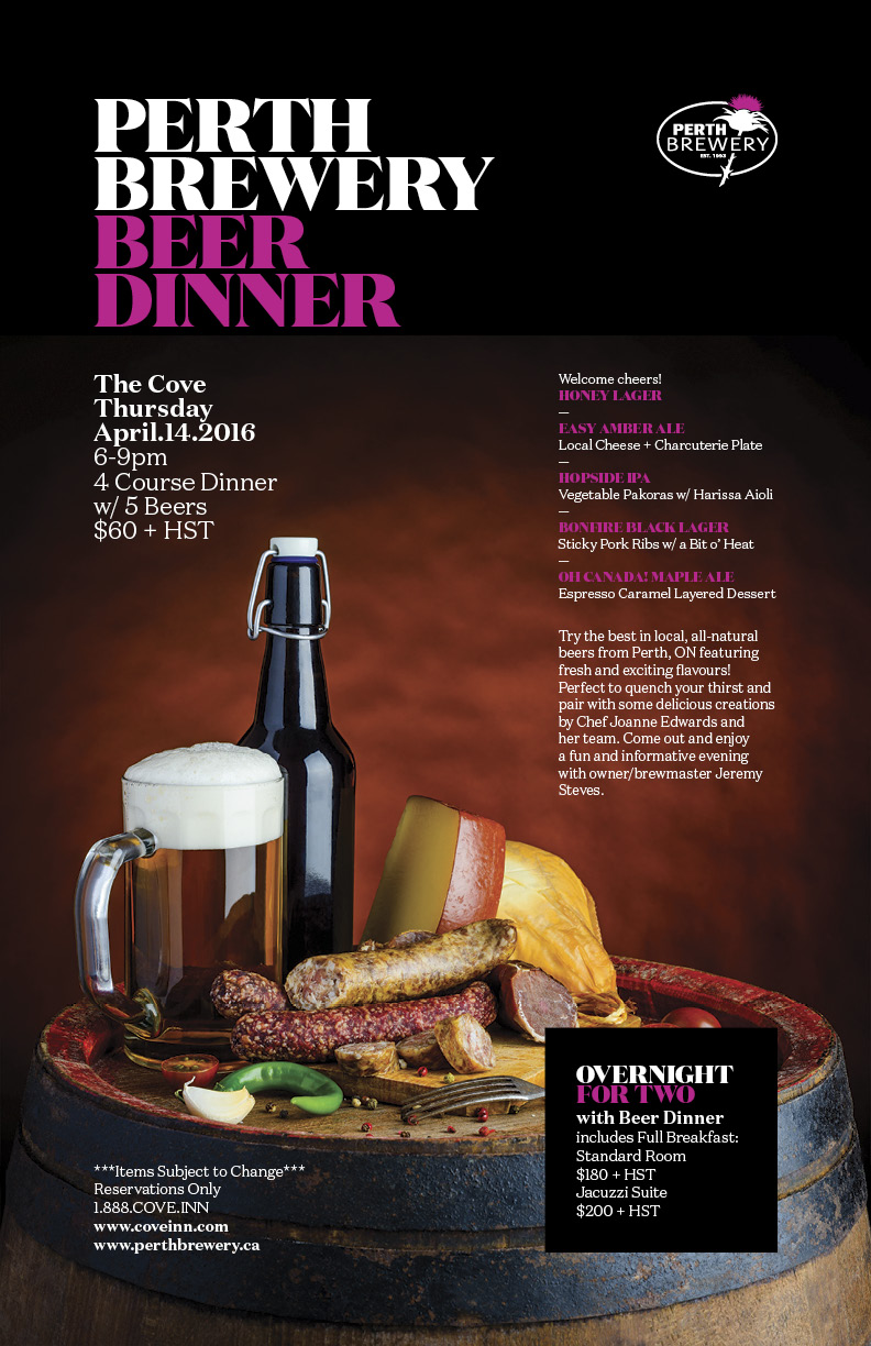 Try the best in local, all-natural beers from Perth, ON featuring fresh and exciting flavours! Perfect to quench your thirst and pair with some delicious creations by Chef Joanne Edwards and her team. Come out and enjoy a fun and informative evening with owner/brewmaster Jeremy Steves.