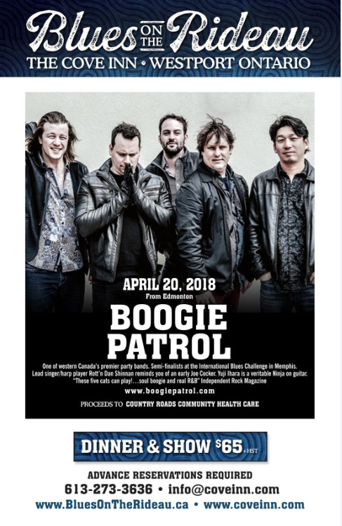 Fri.Apr.20 BLUES on the RIDEAU with BOOGIE PATROL (Edmonton) 7-11pm Buffet + Show $65 + HST www.bluesontherideau.ca www.boogiepatrol.com