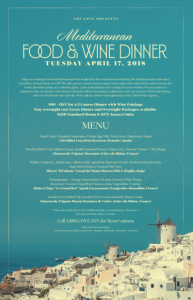 Tue.Apr.17 MEDITERRANEAN WINE DINNER 5 Course Wine Dinner with Wine 6-9pm $75 + HST