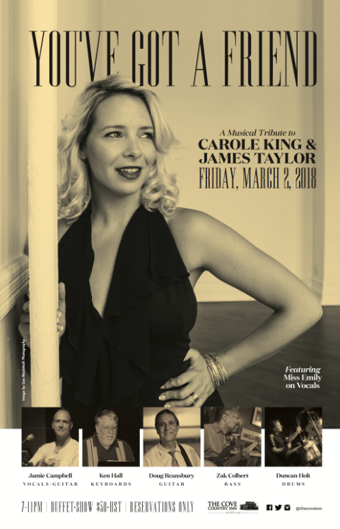 Fri.Mar.2 YOU’VE GOT A FRIEND: A Musical Tribute to CAROLE KING and JAMES TAYLOR feat. MISS EMILY (Classic Folk/Rock, Kingston) 7-11pm $ 50 + HST Buffet & Show