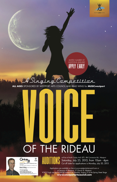You said it Ella. MUSICwestport in conjunction with Brad Wing of Century 21 Real Estate is excited to announce The VOICE of the Rideau 2015 all ages singing competition. VOTR is back this summer and we’re eager to follow the music until the best amateur singer on the Rideau is crowned at the MUSICwestport open air music festival. Sing it. Win it.